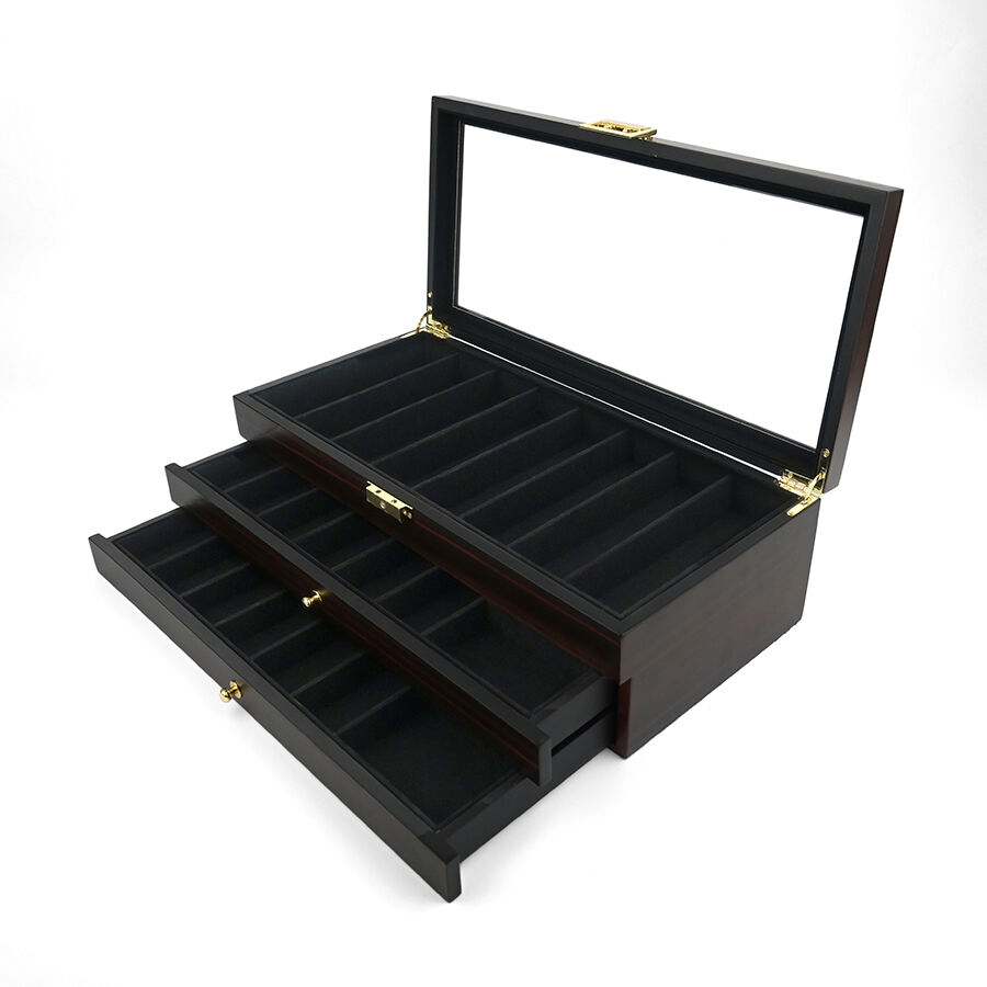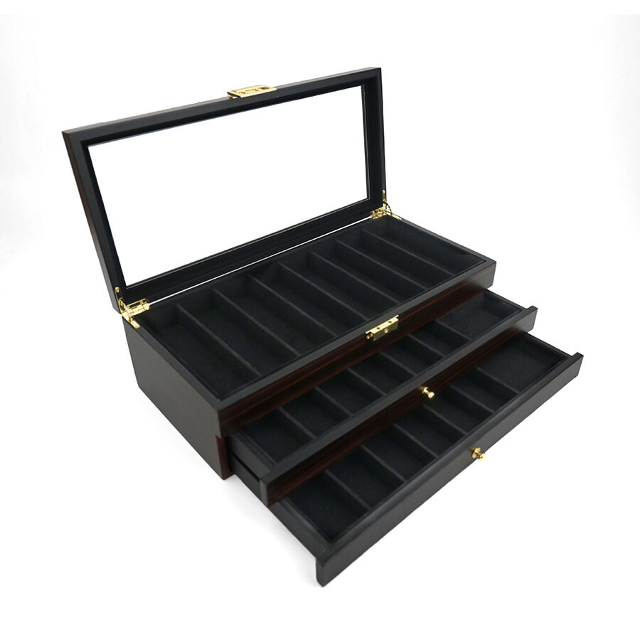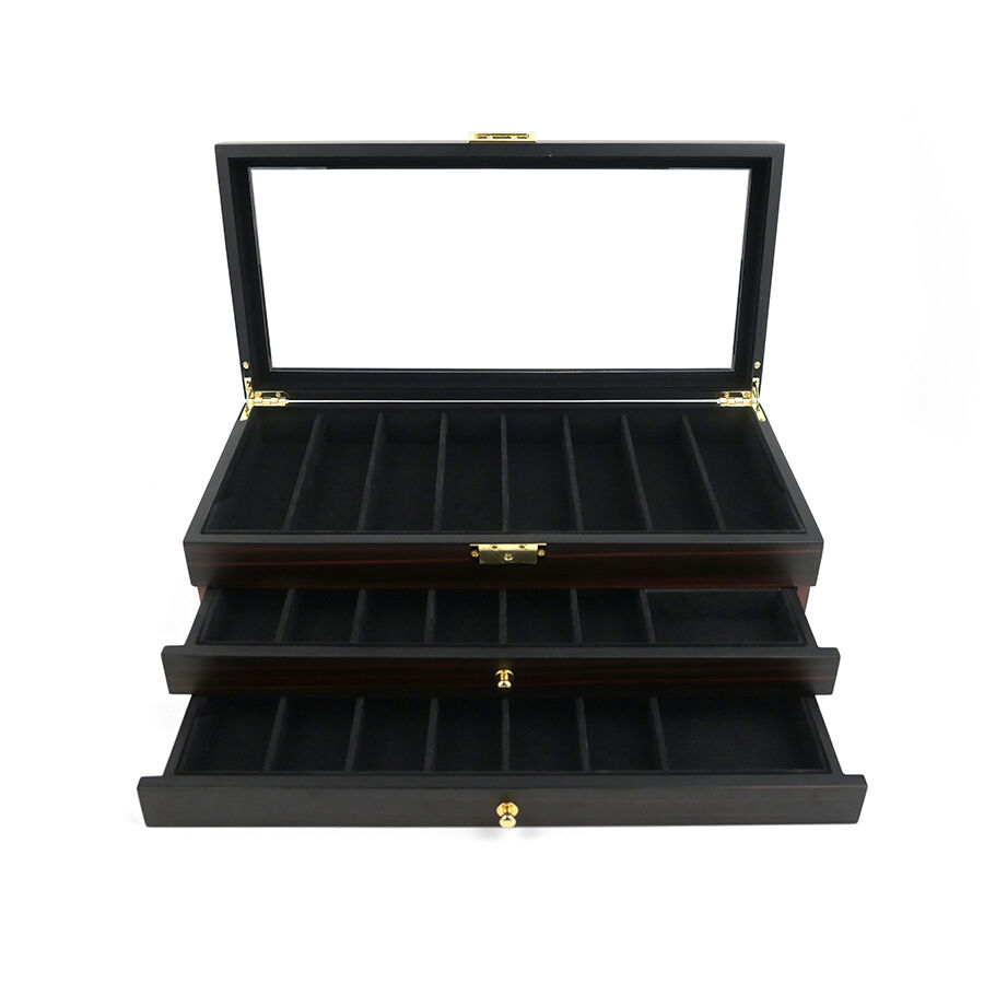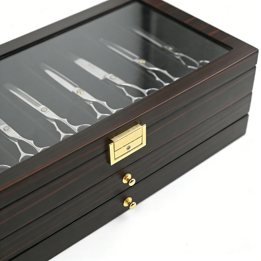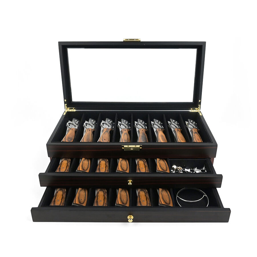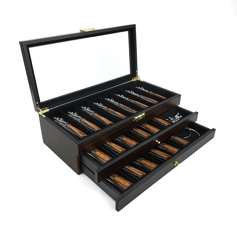 Trelags træopbevaringskasse med lås, ebensorttømmerlakfinish, gennemsigtigt vindue, støvfrit udstillingsskab til militær kniv, suppeske og hårsaks.