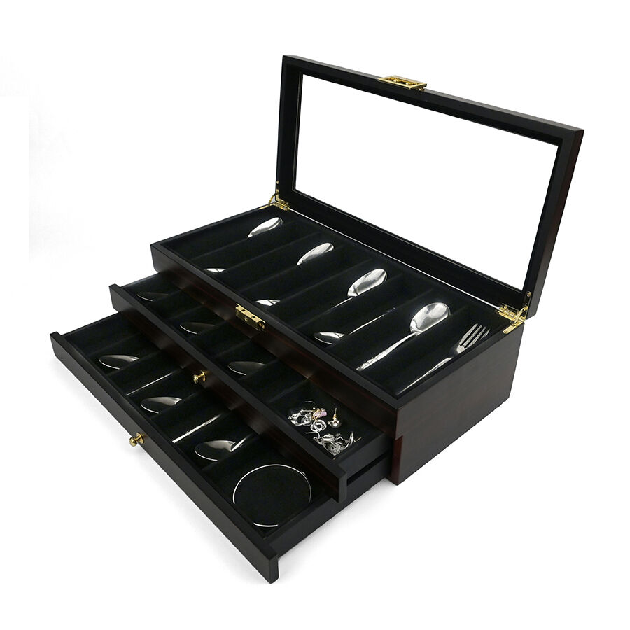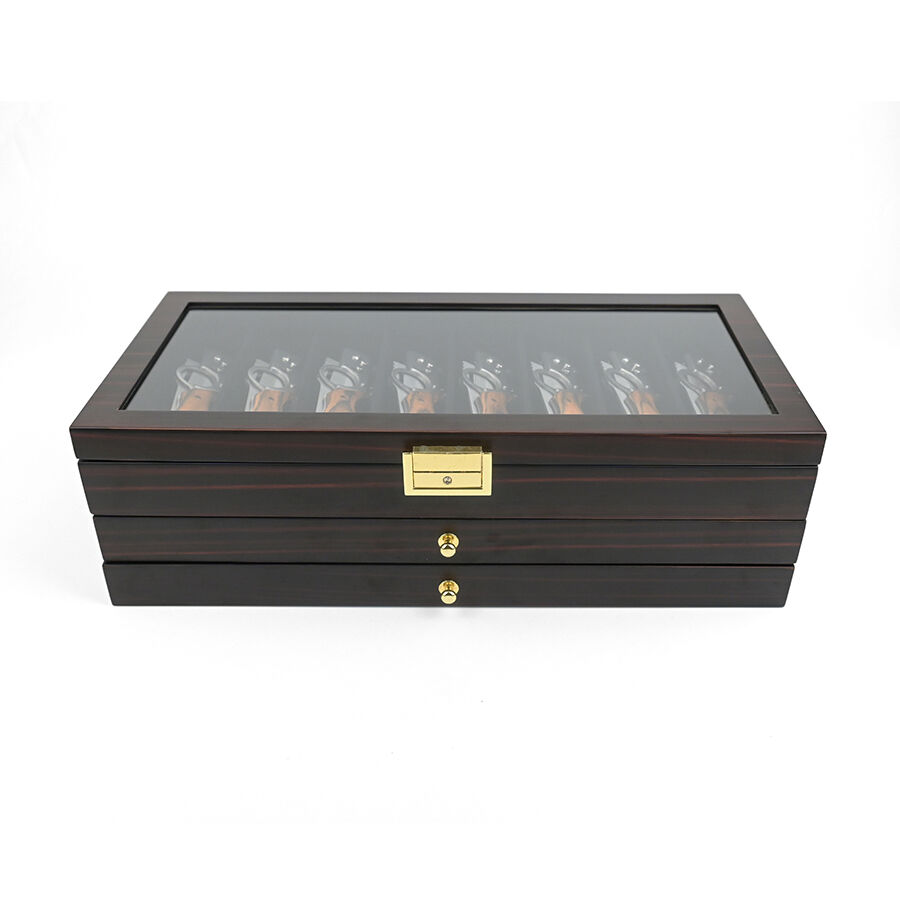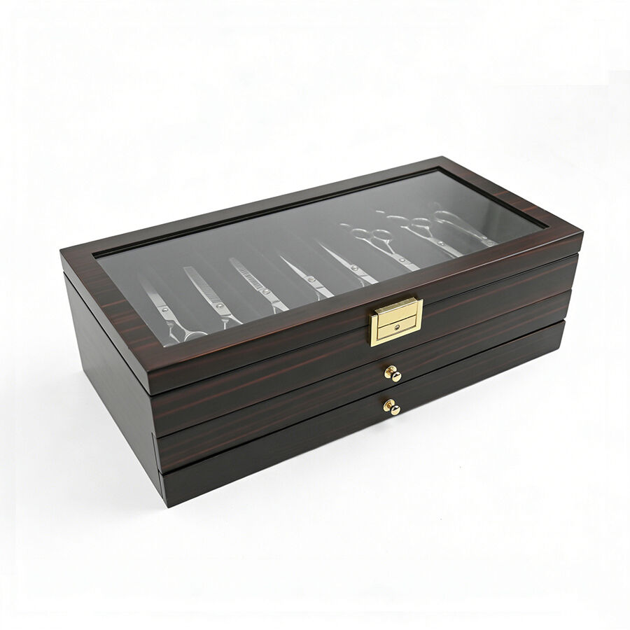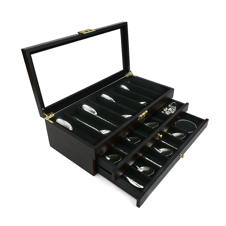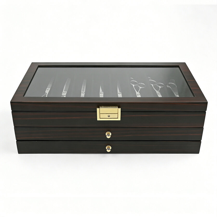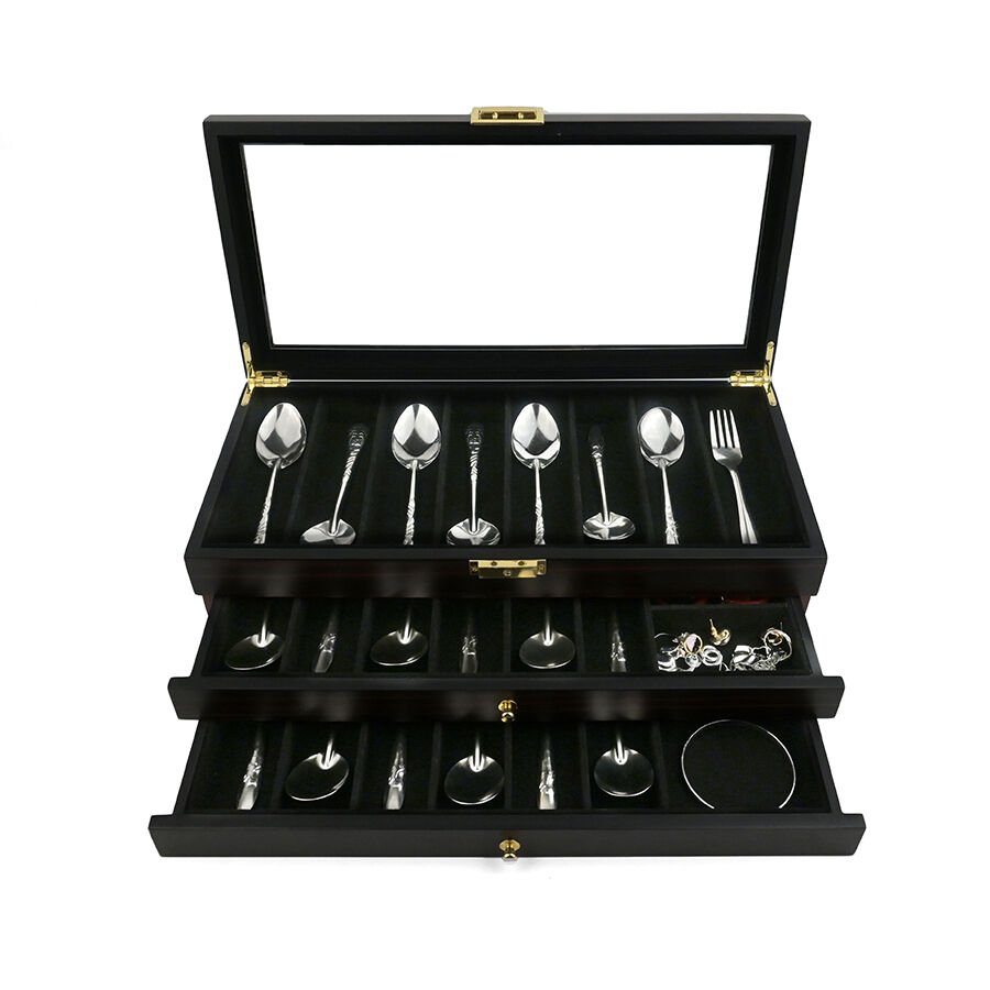 Trelags træopbevaringskasse med lås, ebensorttømmerlakfinish, gennemsigtigt vindue, støvfrit udstillingsskab til militær kniv, suppeske og hårsaks.