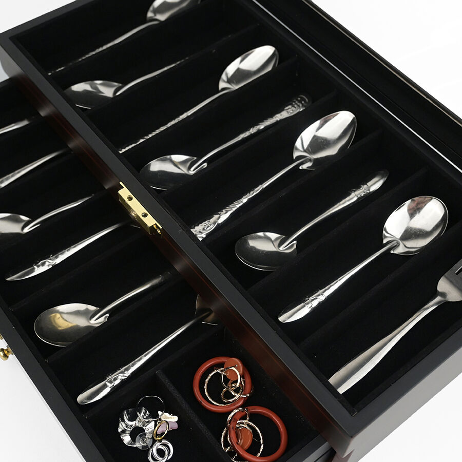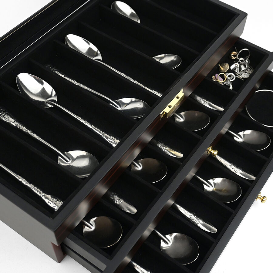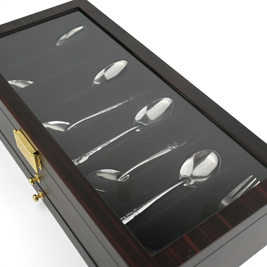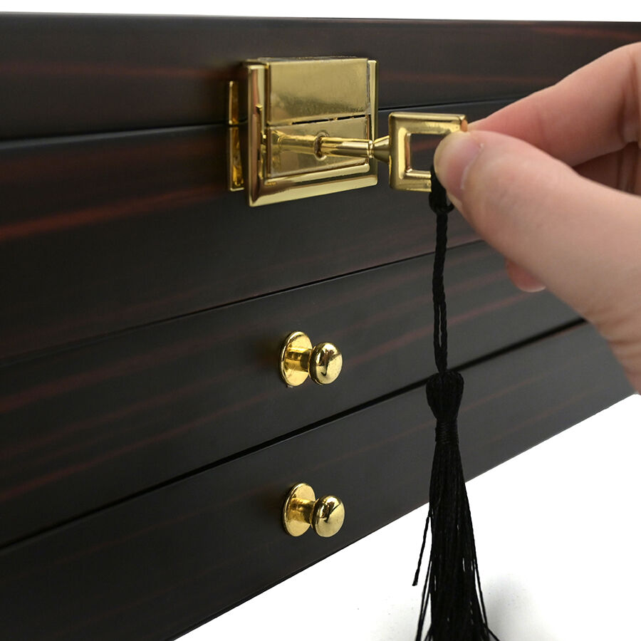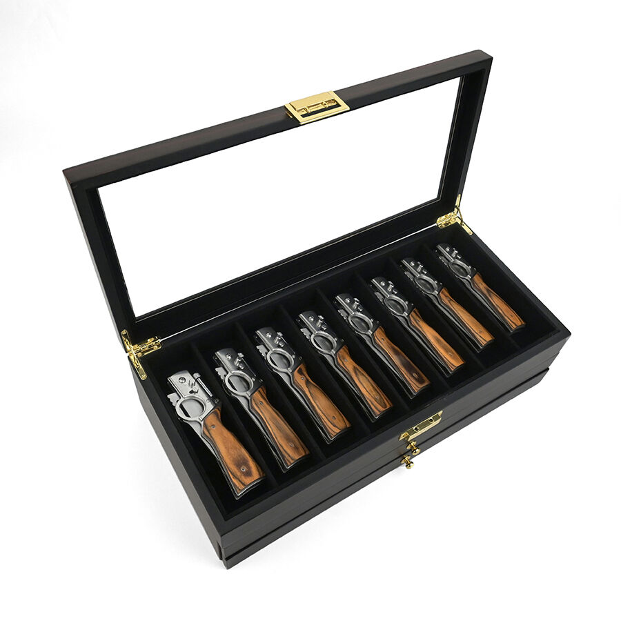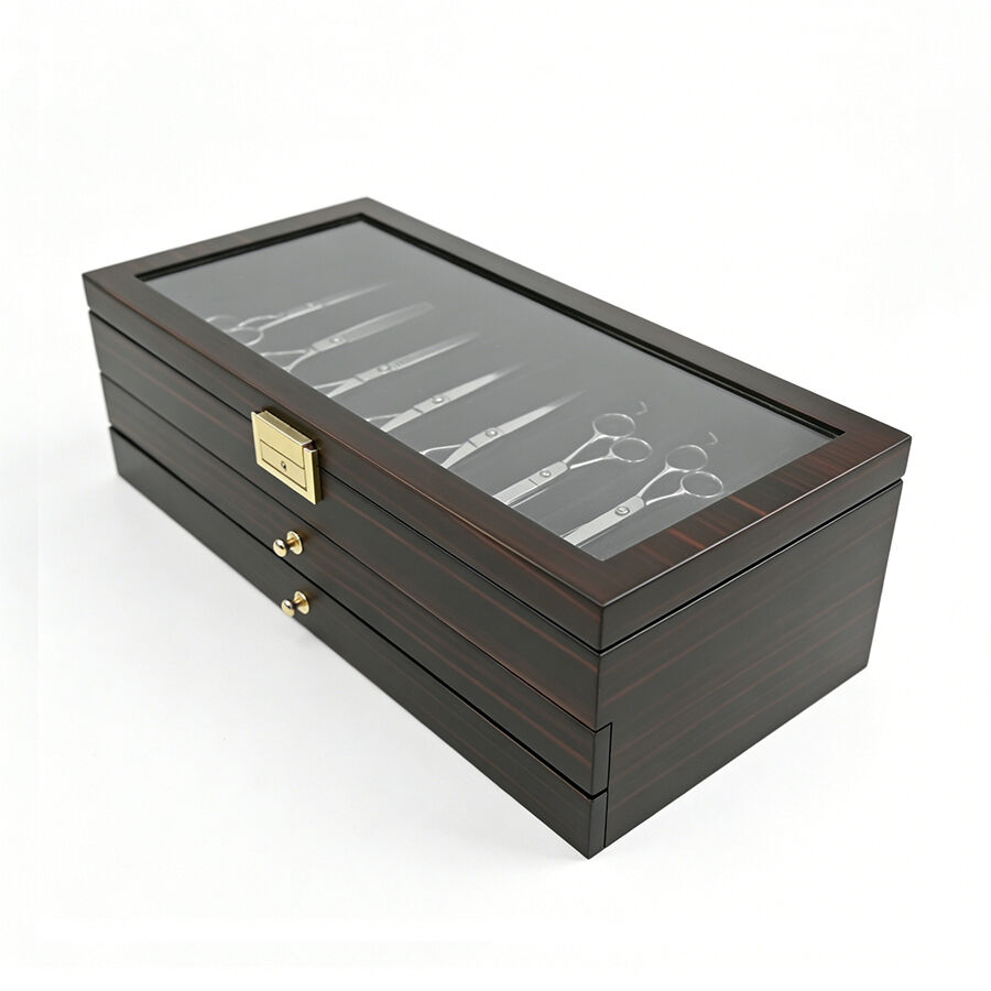Trelags træopbevaringskasse med lås, ebensorttømmerlakfinish, gennemsigtigt vindue, støvfrit udstillingsskab til militær kniv, suppeske og hårsaks.