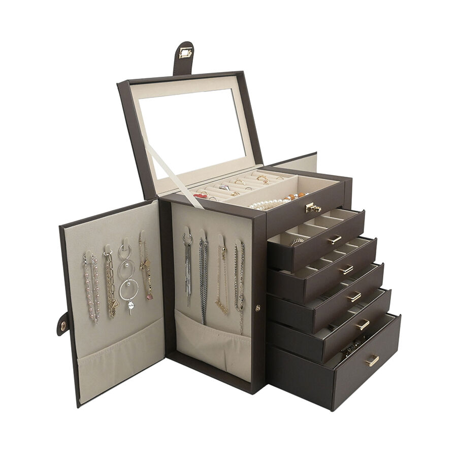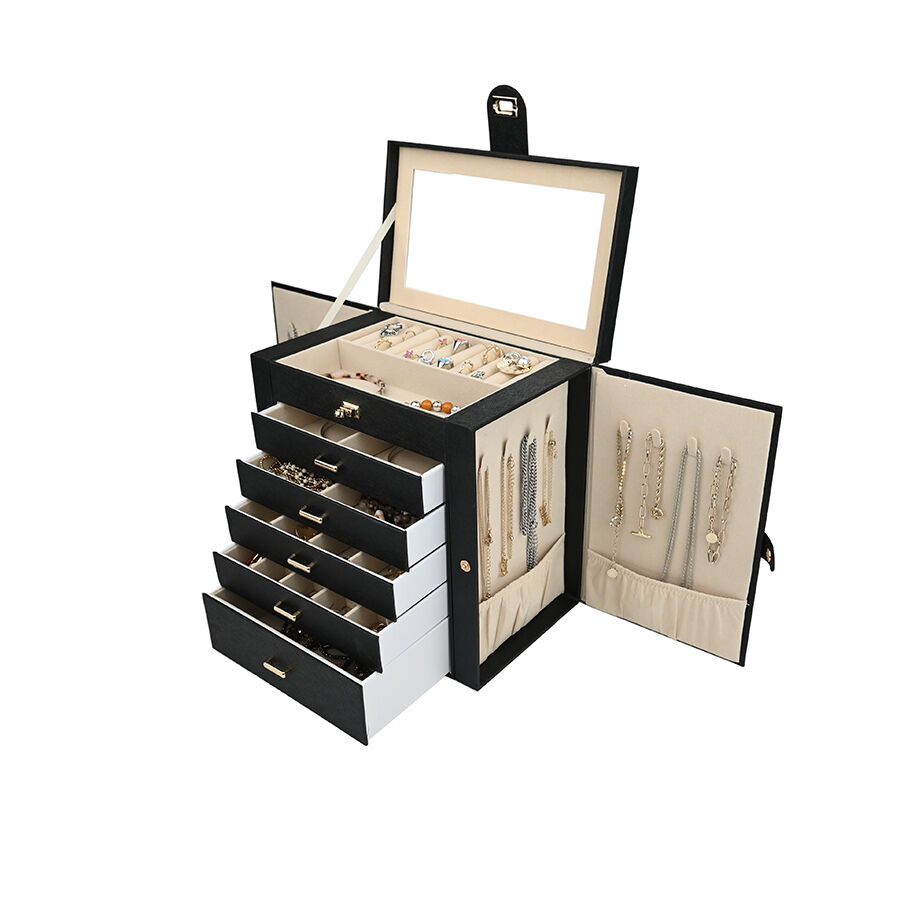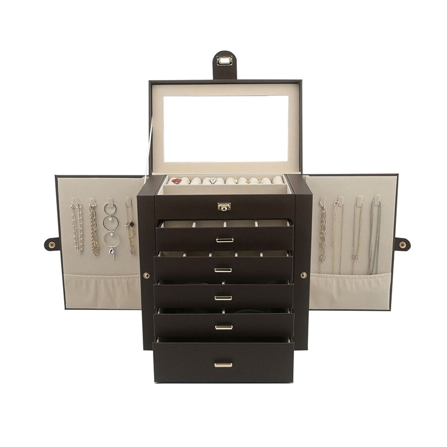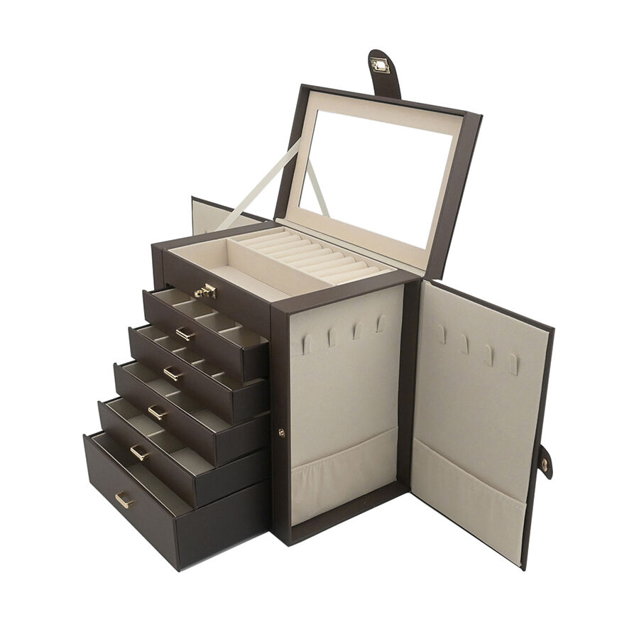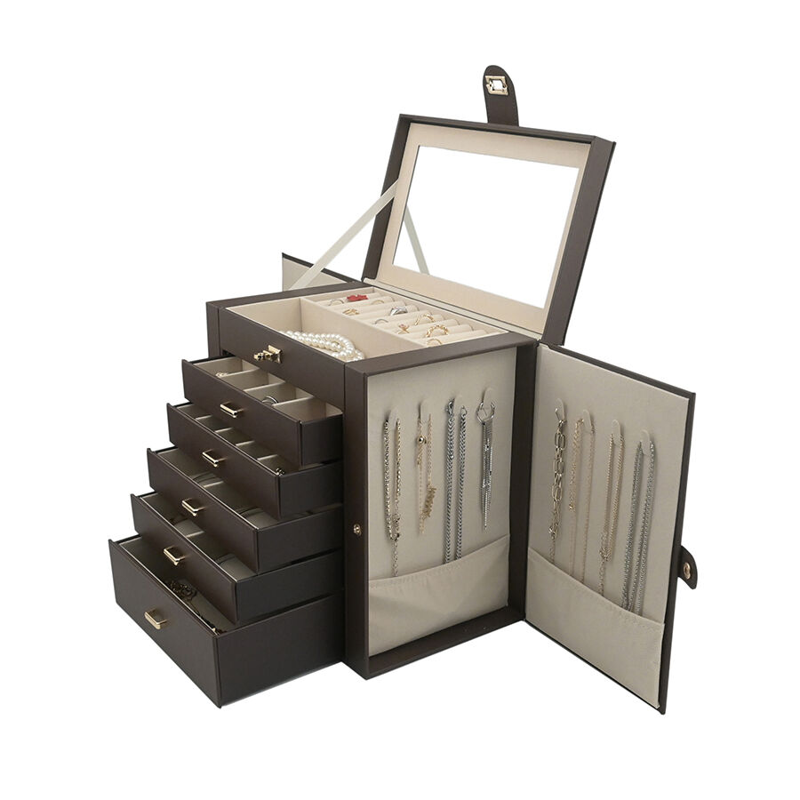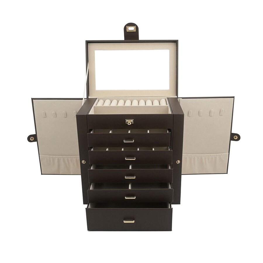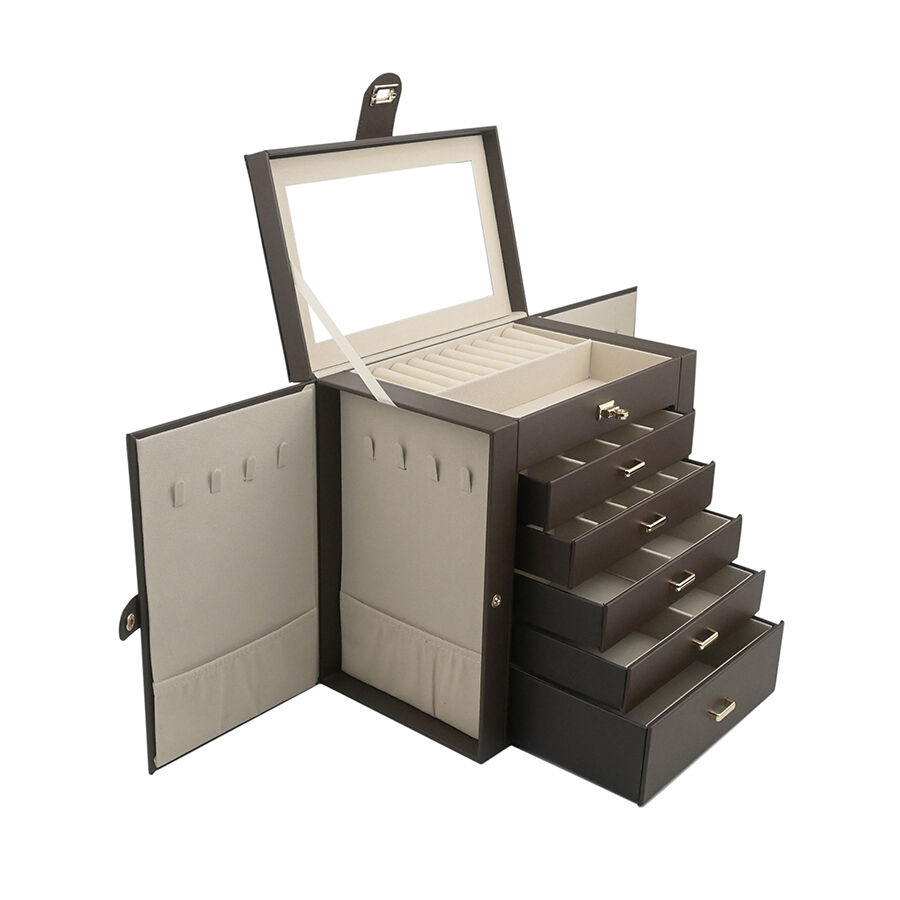 उच्च-क्षमता वाला छह-स्तरीय प्रीमियम लेदर गहने का बॉक्स अंगूठियों, हार और व्यक्तिगत सहायक उपकरणों के लिए, बहुक्रियाशील भंडारण व्यवस्थितकर्ता