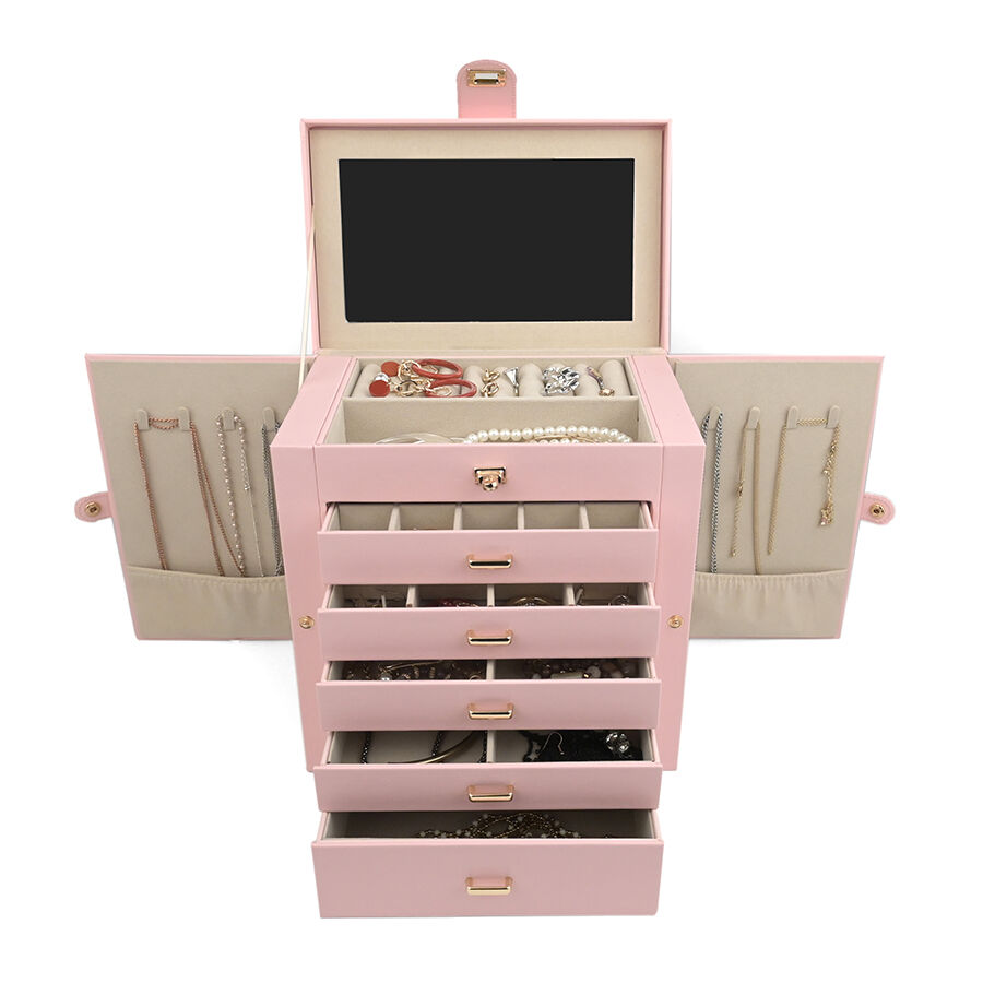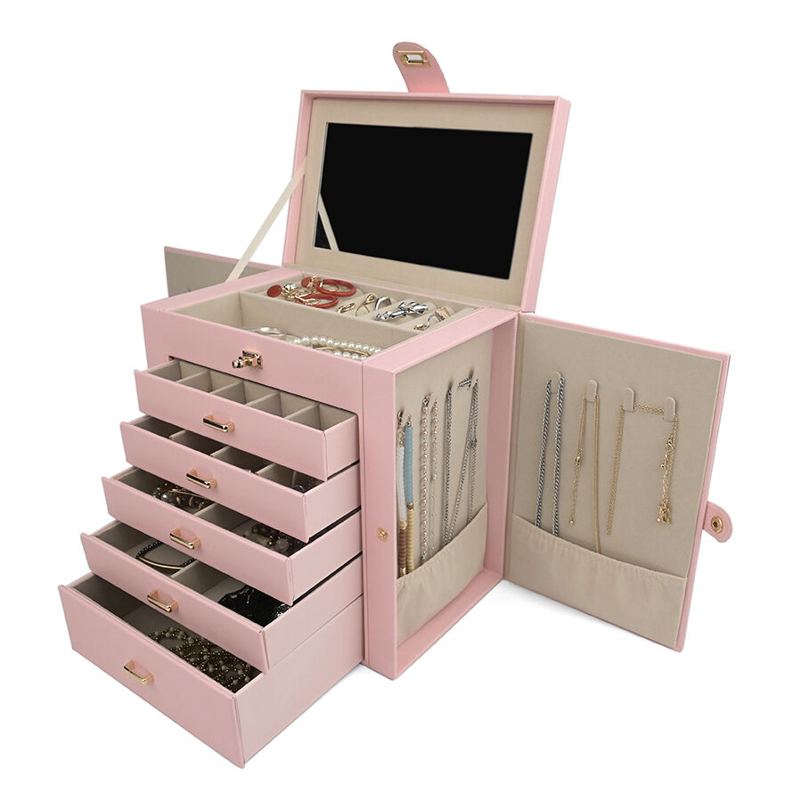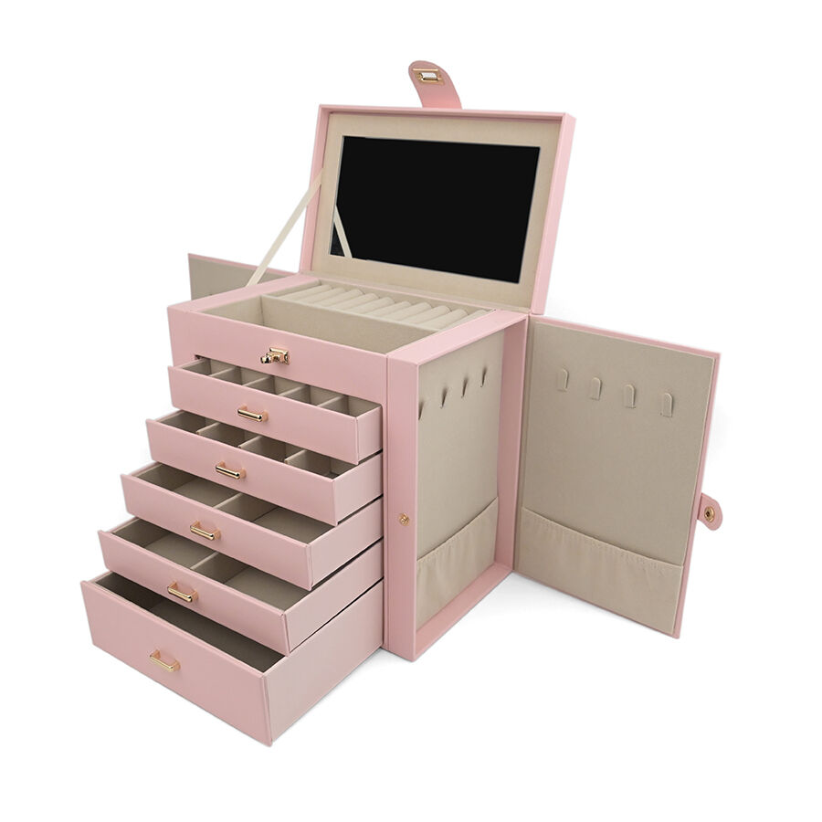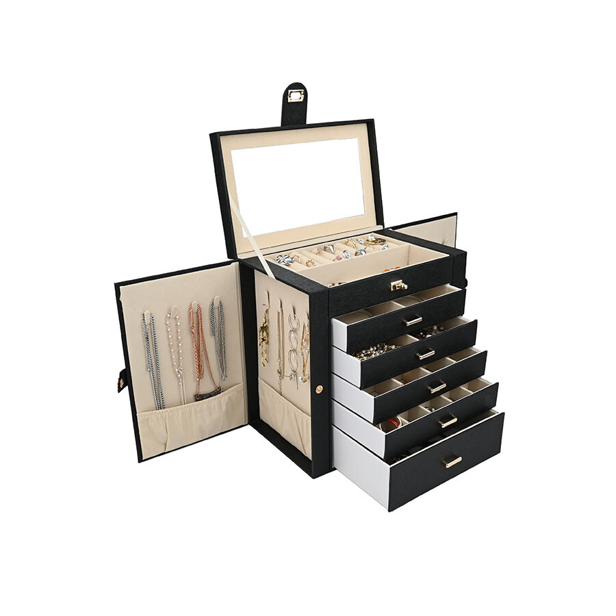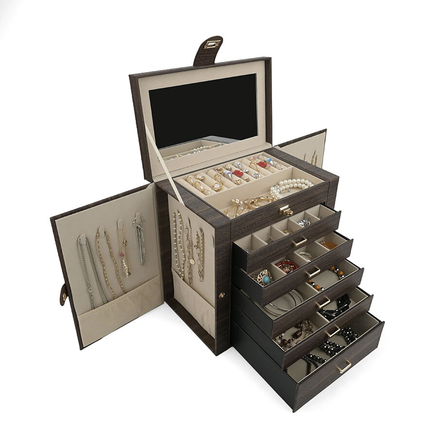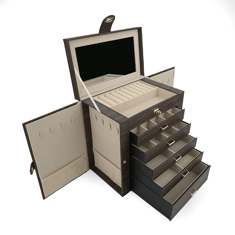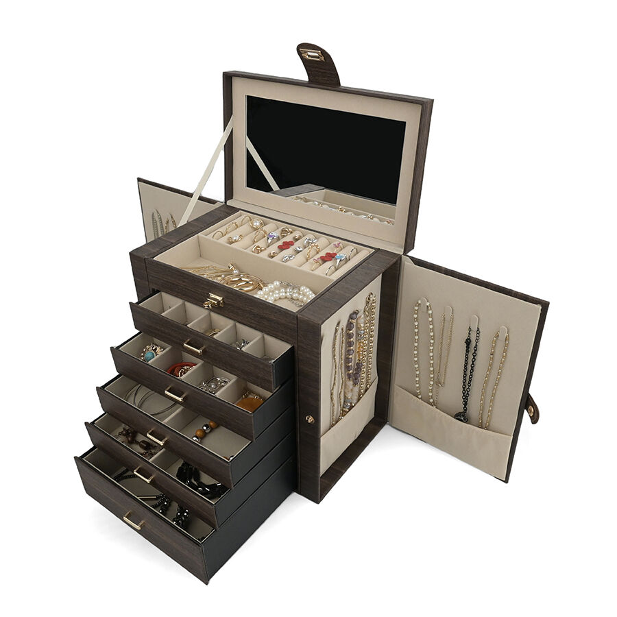 उच्च-क्षमता वाला छह-स्तरीय प्रीमियम लेदर गहने का बॉक्स अंगूठियों, हार और व्यक्तिगत सहायक उपकरणों के लिए, बहुक्रियाशील भंडारण व्यवस्थितकर्ता