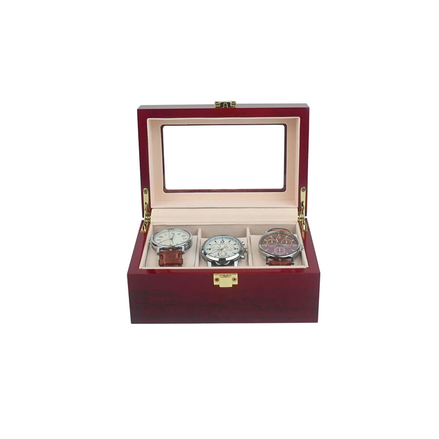 Kifinomult, 3 pozíciós, lakkolt órásdoboz, pormentes és hordozható óra-szervező otthoni használatra, megjelenítésre szolgáló tetőablakkal.