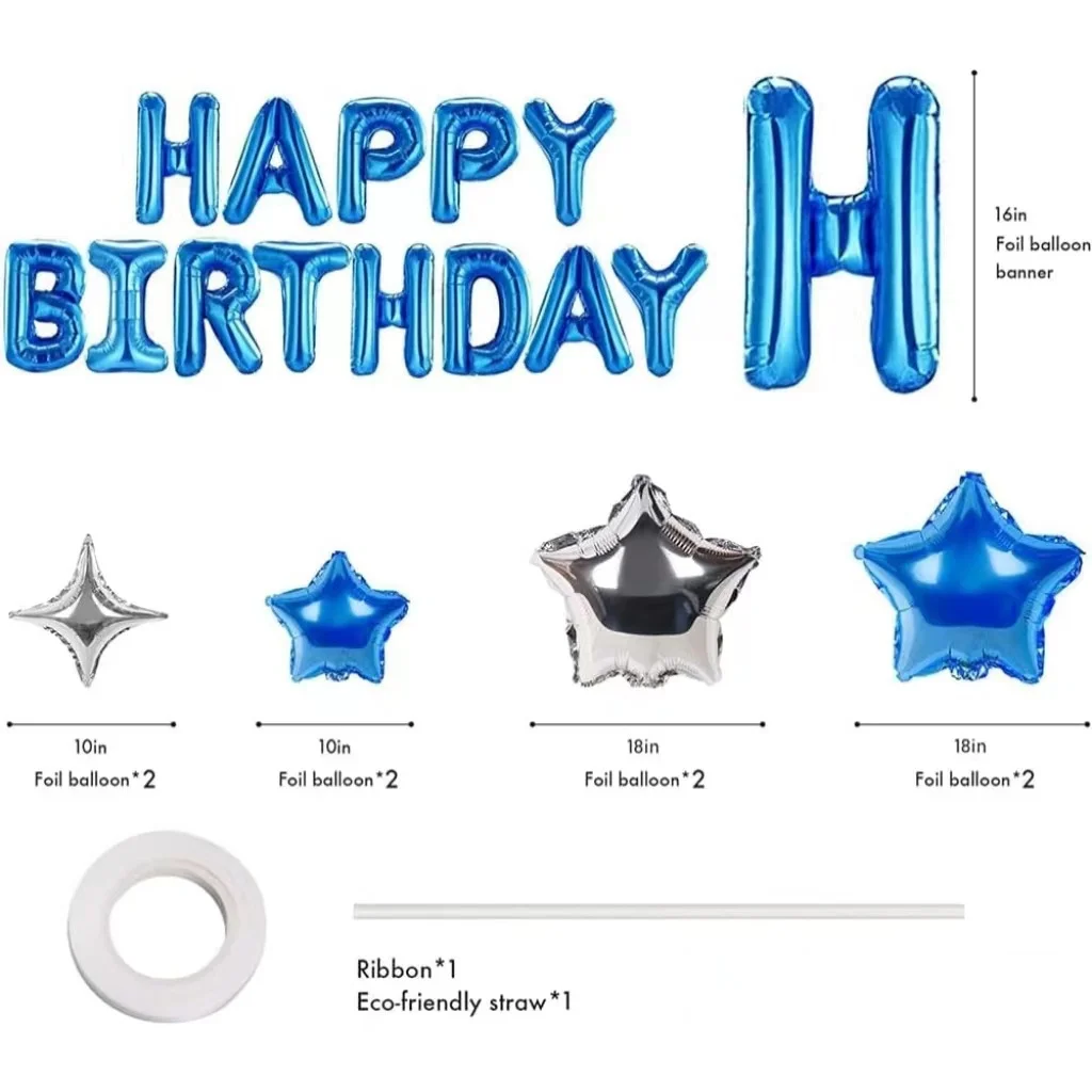 The set includes a mix of colorful foil balloons, including a large "Happy Birthday" banner balloon and star-shaped balloons. These high-quality balloons are made from durable aluminum film, ensuring they stay inflated and looking great throughout your party.