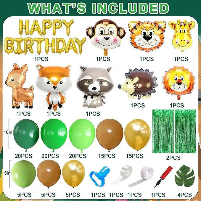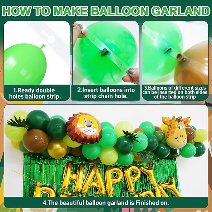 In addition to the balloon garland arch, this kit also includes an assortment of animal-themed decorations to enhance the jungle safari theme. From adorable animal-shaped balloons to leafy green garlands, every detail is thoughtfully designed to create a cohesive and immersive party experience. Your child and their friends will feel like they've stepped into a real-life jungle adventure.