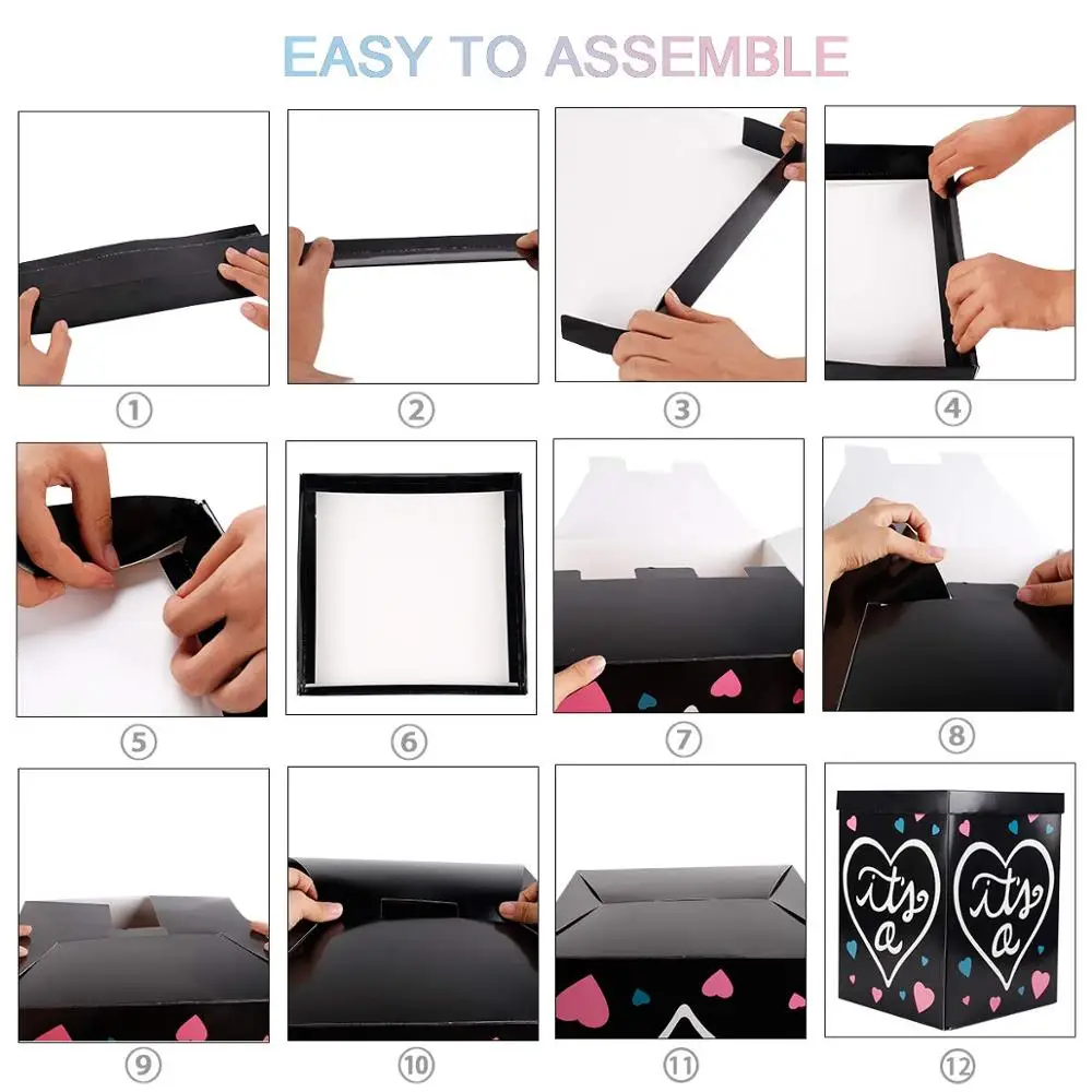 Creating a memorable gender reveal party has never been easier with this convenient DIY balloon box. Simply assemble the paper box, fill it with the included pink or blue balloons (depending on the gender of your baby), and get ready to reveal the big surprise in style. The sturdy construction of the box ensures that it will hold the balloons securely until it's time to unveil the gender.