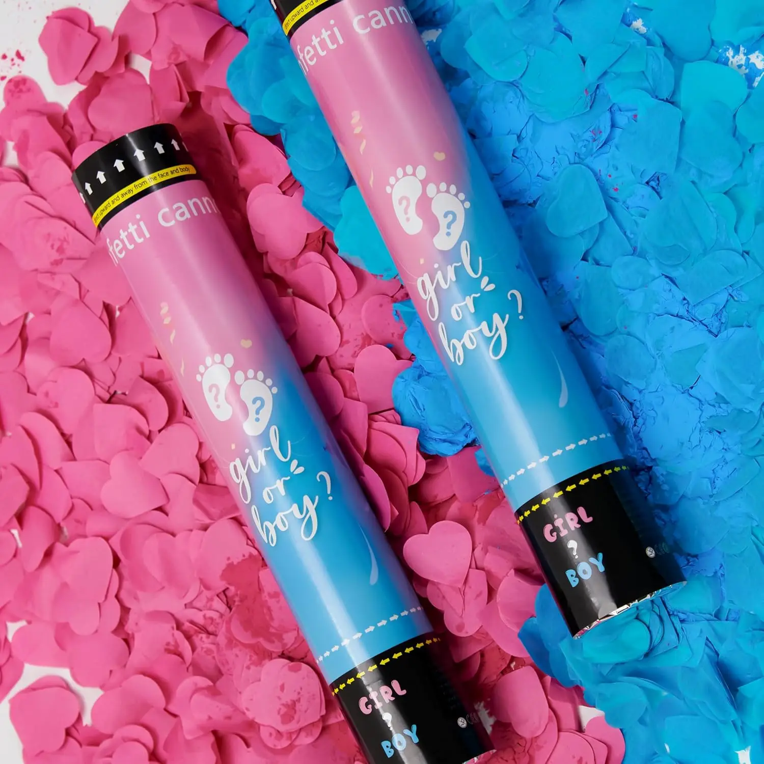 Each cannon is filled with pink or blue heart-shaped confetti, depending on the gender you are revealing. Simply twist the bottom of the cannon to release a shower of confetti in the color of your choice. Your guests will love the thrill of finding out if it's a boy or a girl as the confetti cascades down around them