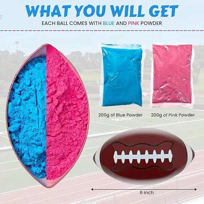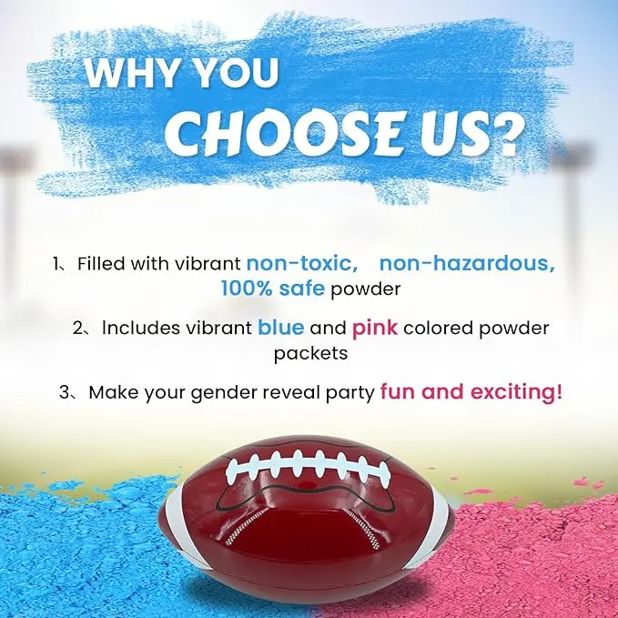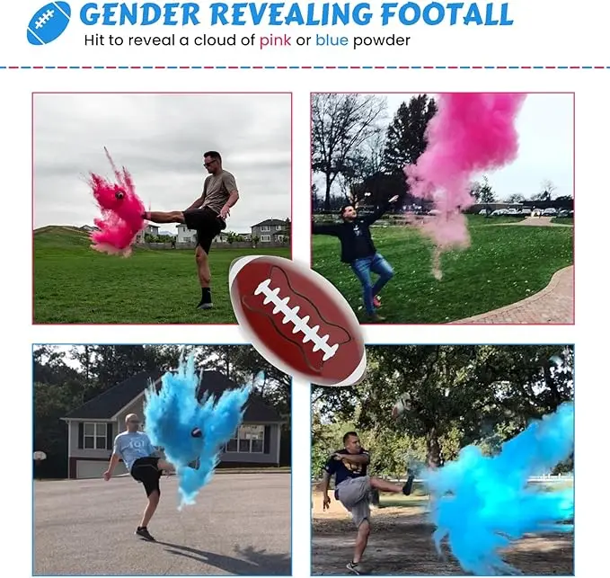 Simply fill the football with the colored powder of your choice - blue for a boy or pink for a girl - and then kick or throw the ball to reveal the surprise inside! The ball is designed to explode upon impact, creating a dramatic burst of color that will leave everyone in awe.