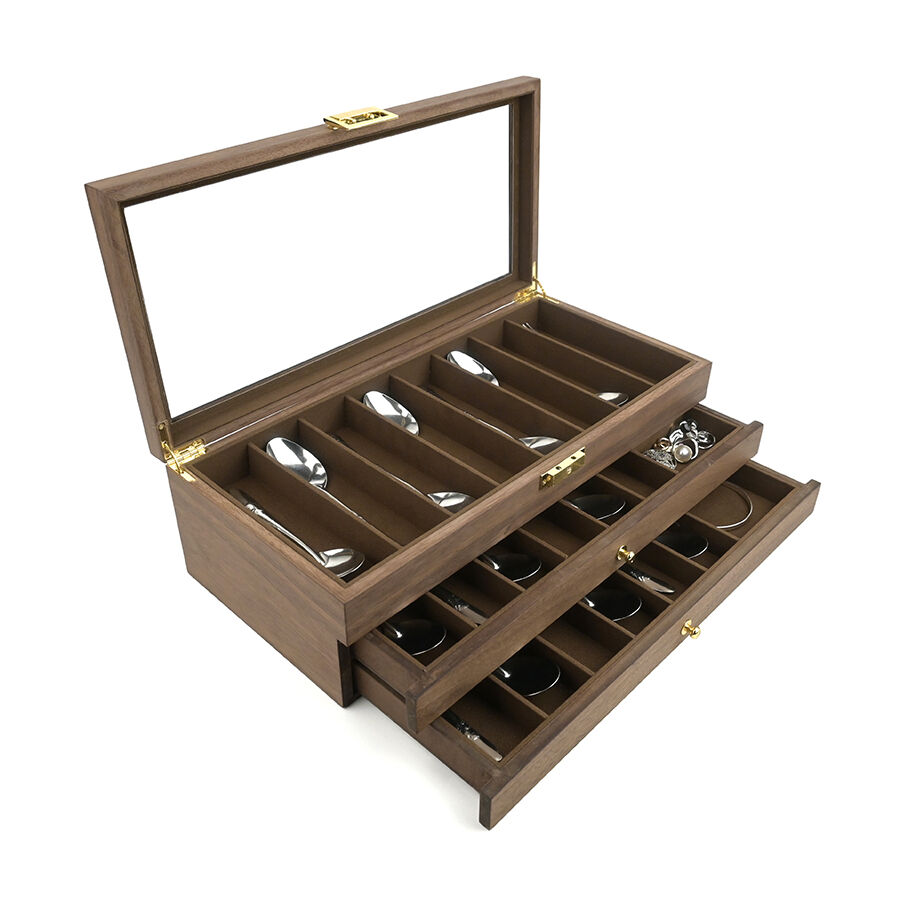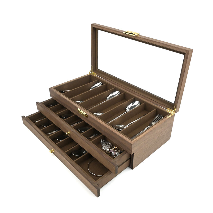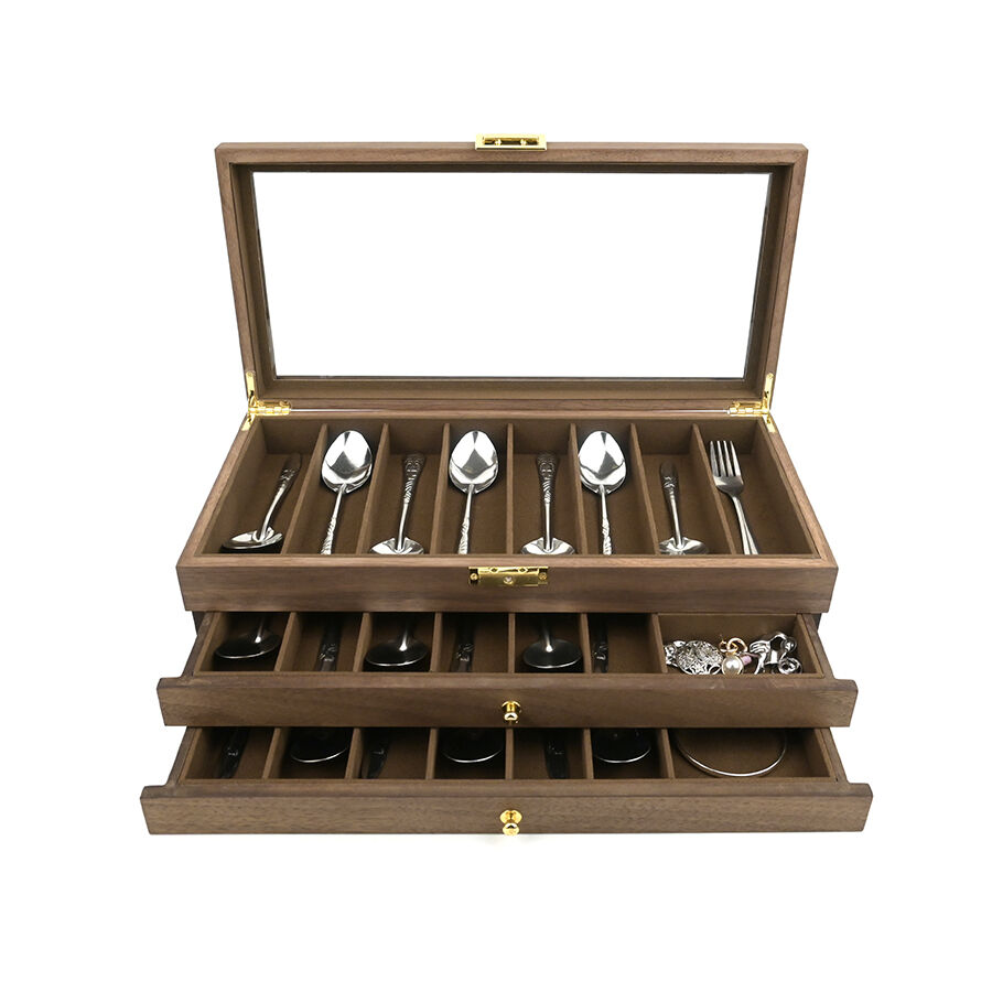 Three-layer wooden knife storage box with transparent skylight, dustproof and lockable design; display box for soup spoons and hairdressers.
